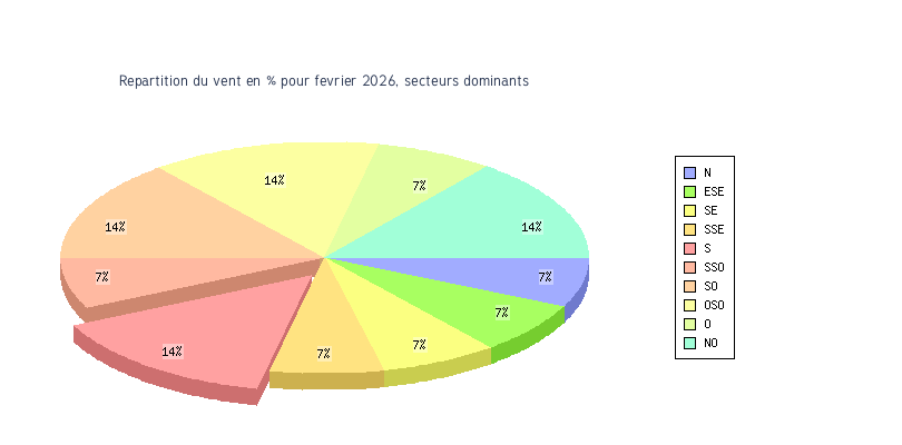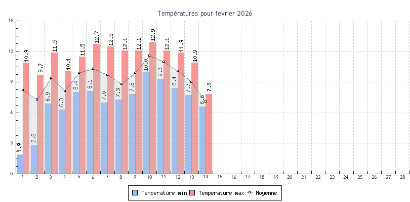 - Jour le plus chaud du mois : 10 fevrier avec une moyenne journalière de : 11.6 °C