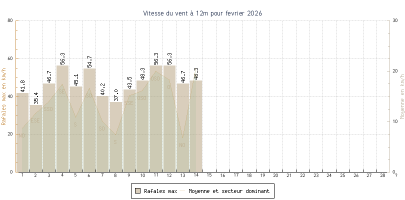 - Rafales la plus élevée à 12m : 56.3 km/h le 4 à 12:49